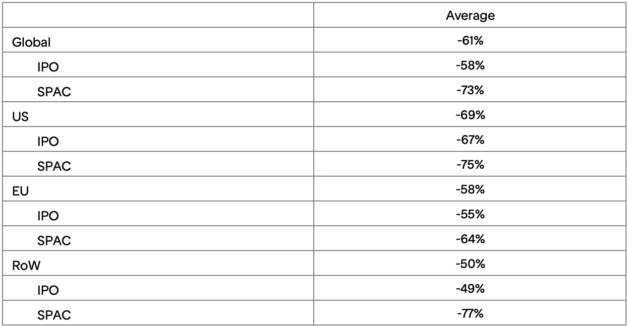 If we take a closer look at our dataset, we can see that US companies have taken the biggest hit, with an average decline of 67% from their IPO price, while companies from the rest of the world3 (RoW) have fared a bit better overall, down only 49%. SPACs have performed worse than IPOs across all regions.