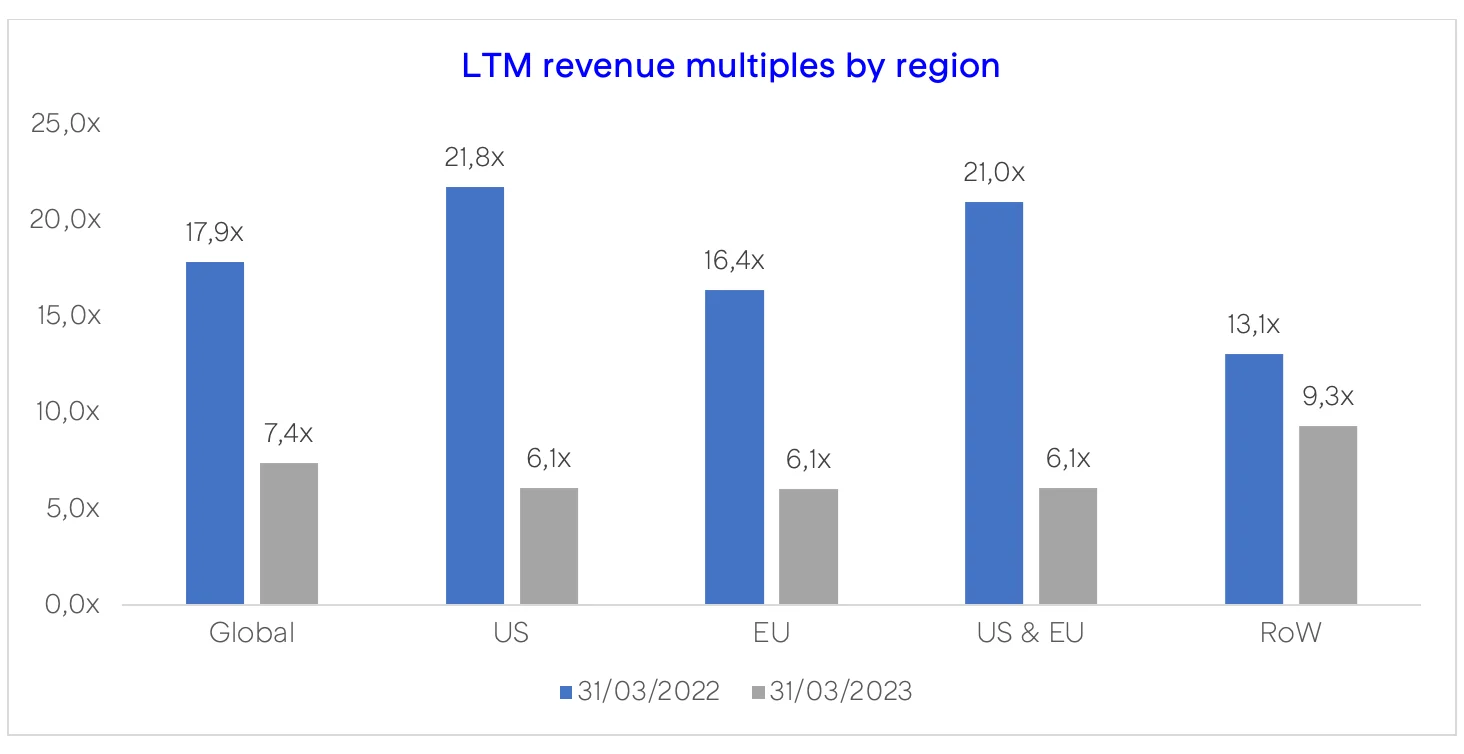 But that's not all - when we look at the change in revenue multiples for these companies, we see a similar trend and reversion to the historical mean. Our global class of 2020-21 saw a decline from 17.9x in Mar-22 to 7.4x in Mar-23, which is a whopping 59% decline. And again, we see that US companies took the sharpest hit, with a decline from 21.8x to 6.1x, while RoW companies only declined from 13.1x to 9.3x.