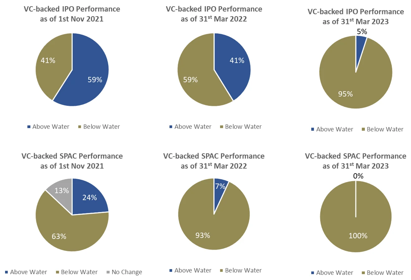 Looking at what proportion of the 2020-21 IPO/SPAC class are trading above or below their listing price at different points in time, we see that only 5% of companies were trading above their IPO price as of Mar-23. This is a jaw-dropping 54 percentage point decrease from market highs in 2021. The picture for SPACs is similarly bleak, with no SPACs trading above their listing price as of Mar-23. Overall, it's been a tough time for the class of 2020-2021 tech IPOs and SPACs.