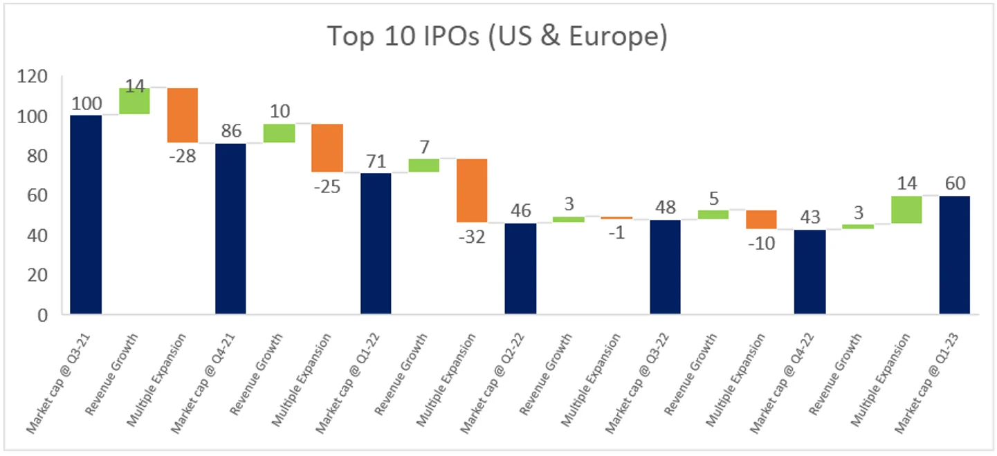 Interestingly, Q1 2023 was the first quarter since the crash where we observed a positive Multiple Expansion Value for this subset of companies, which led to a notable increase in average market capitalization from 43 to 60. Could this be an inflection point for public tech companies? Are investors starting to price in risk again? It's too early to tell from this smaller sample set of (arguably) high quality companies, but it is certainly a positive sign for the 2020-21 IPO/SPAC class.