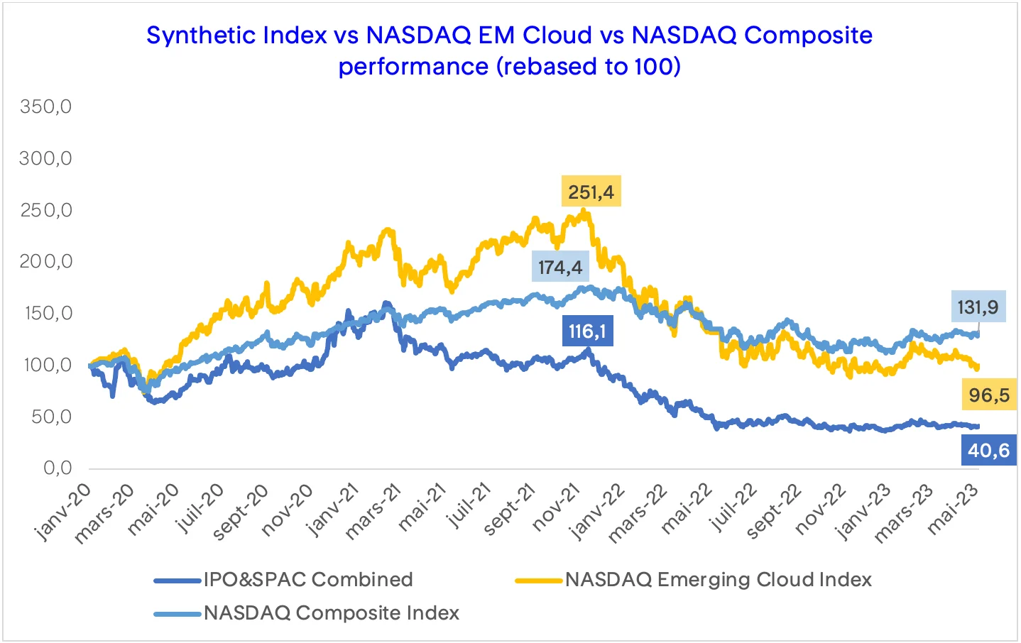 Upon analysing the chart, it is apparent that the synthetic index has been the weakest performer of the three, with the NASDAQ Emerging Cloud ranking second, followed by the NASDAQ Composite. This can be attributed to the lacklustre performance of technology companies in the public markets, particularly newly listed ones, over the last 12-18 months. If we further scrutinize the chart, it becomes clear that the NASDAQ Composite did not emerge as the top-performing index until May 2022. At its November 2021 peak, the NASDAQ EM Cloud was up 251% since January 2020, compared to the NASDAQ Composite's 174%.