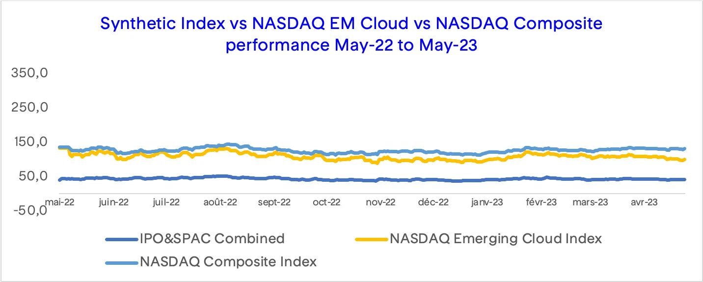 Interestingly, the synthetic index has consistently underperformed relative to the other two indices, almost always following a similar trend to the NASDAQ EM Cloud, which is not surprising given that the latter has a greater weighting towards more recent tech IPOs. Focusing on the last twelve months, we can observe that all three indices have remained relatively flat: