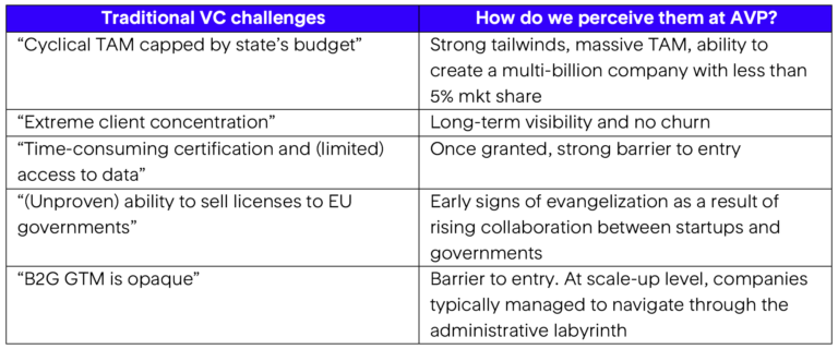 In the US, defence and intelligence agencies are heavily fragments, the opposite tends to happen in Europe where they are more centralized: the State usually end up being the only payer in town. Extreme customer concentration is commonly perceived as a risk when valuing startups, but doing so in the case of B2G misses the true value of contracting with defence departments. It may be hard to get them onboard, but once they are in, they never churn. And while B2G contracting is not easily linkable to traditional SaaS metrics such as LTV, they grant unmatched long-term visibility to investors, and as more use cases are developed upsell is often guaranteed.