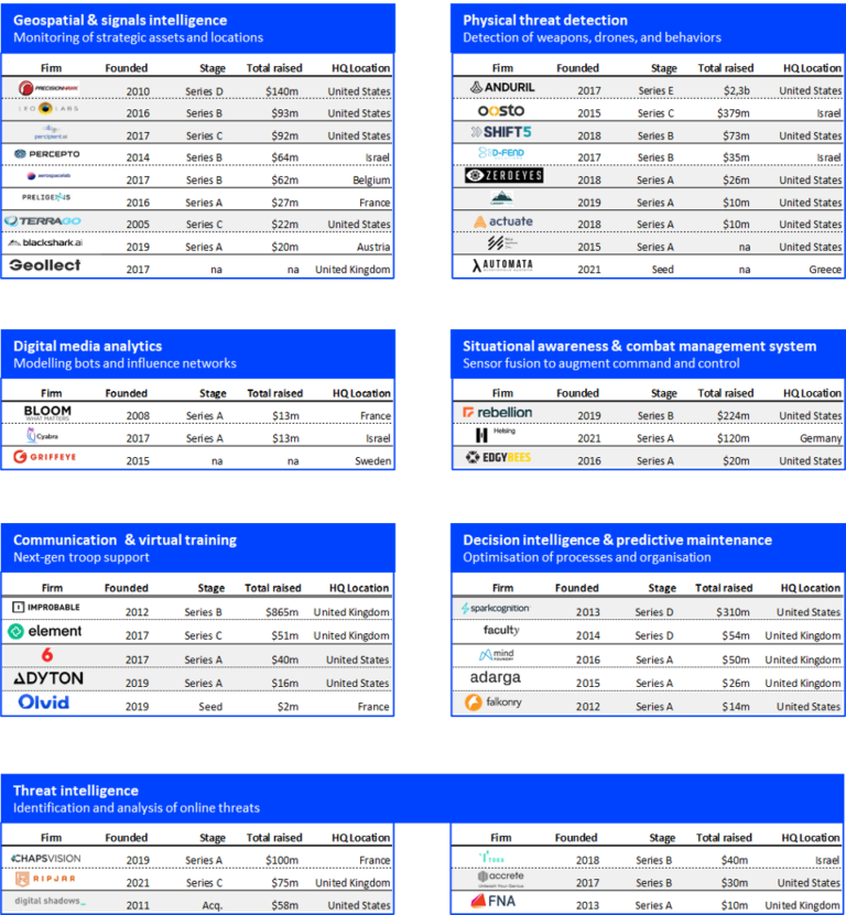 - We deliberately excluded cybersecurity as (i) extensively covered by fellow colleagues and (ii) we felt it would obfuscate the mapping. However, there are few exceptions such as Shift5, which has been included for its data protection solutions of weapon systems